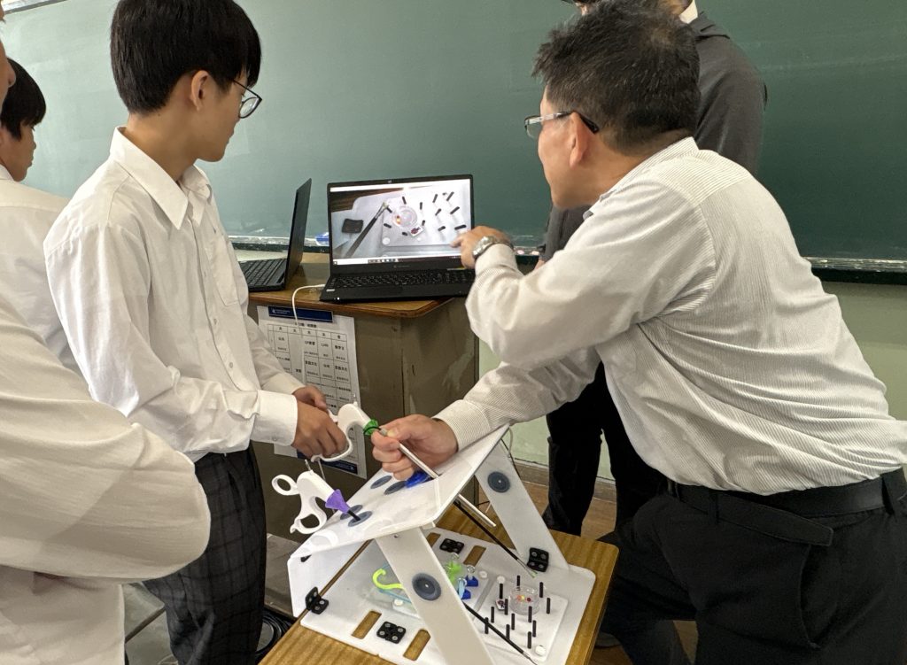 カメラ映像をパソコン画面で確認しながら、細い器具を操作して小さな球を移動させたり、板をひっくり返したりすることで、実際の内視鏡手術のような繊細な動きを体験しました。