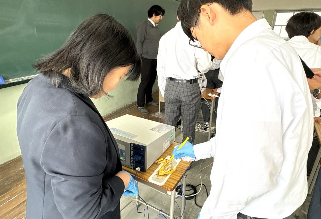 今回の授業では、医療現場で使われている「電気メス」と「内視鏡シミュレーター」を実際に体験してもらいました。